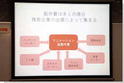 今回の講義では、アニメーション業界で製作費がどの様に集められ、アニメーターなどの制作者に給与が支払われるか、大きなお金の流れなどについてお話頂きました。