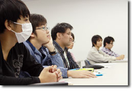 真剣に説明に聴き入る学生たち。