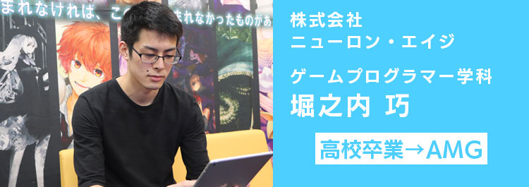 株式会社ニューロン・エイジに、在校生が内定をいただきました!内定者であるゲームプログラマー学科・堀之内 巧くんに、AMGでの思い出や就職が決まるまでの道のりをお聞きしました。