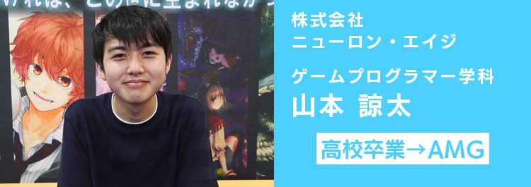 株式会社ニューロン・エイジに、在校生が内定をいただきました!内定者であるゲームクリエイター学科・山本諒太くんに、AMGでの思い出や就職が決まるまでの道のりをお聞きしました。