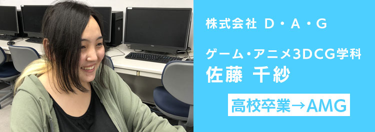 株式会社 D・A・Gに、在校生が内定をいただきました!内定者であるゲーム・アニメ3DCG学科・佐藤千紗さんに、AMGでの思い出や就職が決まるまでの道のりをお聞きしました。