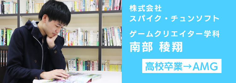 株式会社スパイク・チュンソフトに、在校生が内定をいただきました!内定者であるゲームクリエイター学科・南部 稜翔くんに、AMGでの思い出や就職が決まるまでの道のりをお聞きしました。