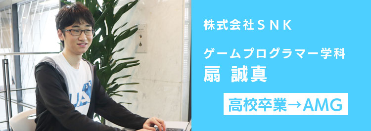 株式会社SNKに、在校生が内定をいただきました!内定者であるゲームプログラマー学科・扇 誠真さんに、AMGでの思い出や就職が決まるまでの道のりをお聞きしました。