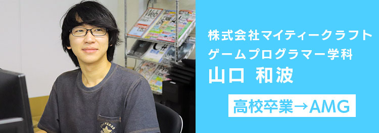 株式会社マイティークラフトに、在校生が内定をいただきました!内定者であるゲームプログラマー学科・山口 和波さんに、AMGでの思い出や就職が決まるまでの道のりをお聞きしました。
