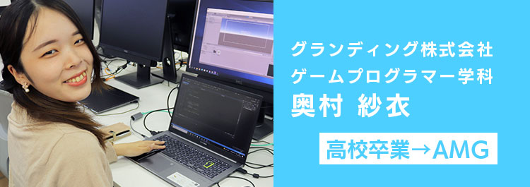 グランディング株式会社に、在校生が内定をいただきました!内定者であるゲームプログラマー学科・奥村 紗衣さんに、AMGでの思い出や就職が決まるまでの道のりをお聞きしました。