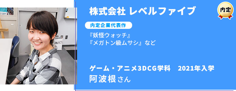 『妖怪ウォッチ』や『メガトン級ムサシ』など、数々の有名タイトルを手掛ける株式会社レベルファイブに、在校生が内定をいただきました!内定者であるゲーム・アニメ3DCG学科・阿波根さんに、AMGでの思い出や就職が決まるまでの道のりをお聞きしました。