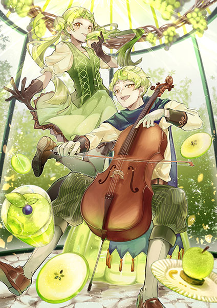 背景やキャラクターを緑色で統一させた、爽やかなイラスト。楽器を弾く男の子の椅子がゼリーになっているなど、遊び心も満載です。