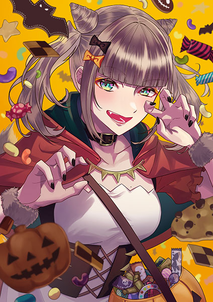 カラフルなお菓子が散りばめられていて、とてもポップなデザイン。かぼちゃのバッグに入っているお菓子のパッケージなど、細かい部分も上手に描かれています。