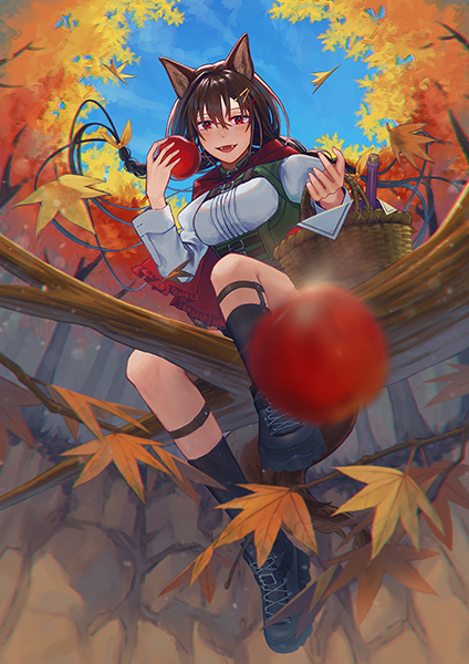 紅葉を背景にした秋らしいイラスト。女の子のキャラクターの服も深い緑色や茶色を基調にしていて、色味でも季節感がしっかりと表現されています。