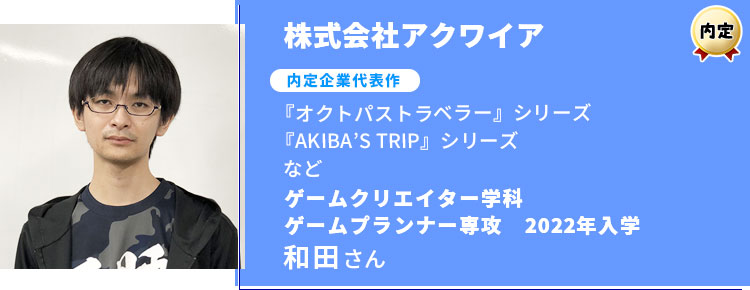 『オクトパストラベラー』シリーズや『AKIBA’S TRIP』シリーズなど、数々の有名タイトルを手掛ける株式会社アクワイアに、在校生が内定をいただきました!内定者であるゲームクリエイター学科(ゲームプランナー専攻)・和田さんに、AMGでの思い出や就職が決まるまでの道のりをお聞きしました。