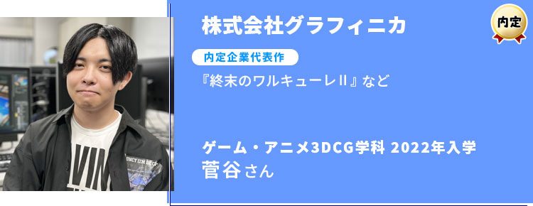 『終末のワルキューレⅡ』など、数々の有名タイトルを手掛ける株式会社グラフィニカに、在校生が内定をいただきました!内定者であるゲーム・アニメ3DCG学科・菅谷さんに、AMGでの思い出や就職が決まるまでの道のりをお聞きしました。