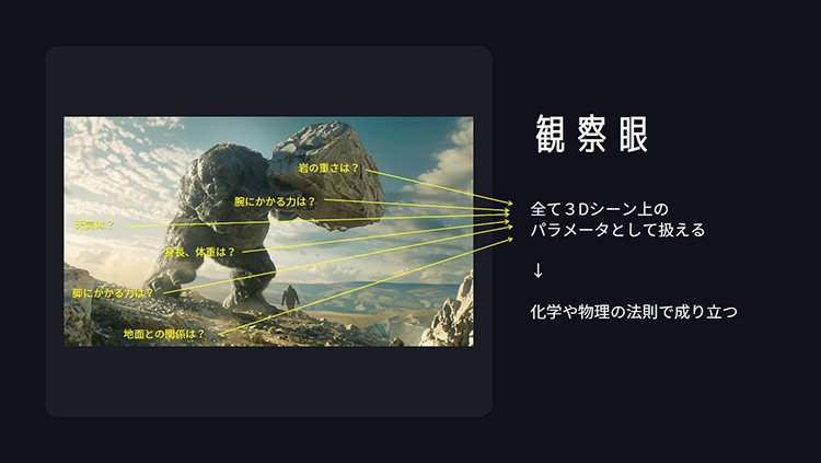 講義冒頭で、私たちが最初に知り、理解しなければならないことは「現実世界で何が起きているのか」であり、「世界の見方をガラッと変えて観察眼を鍛えよう」と、櫻井氏。物体の具体的な特徴、背景の詳細な情報などをとらえる観察眼はCGアーティスト、CGデザイナーにとって大切だというお話をしてくださいました。