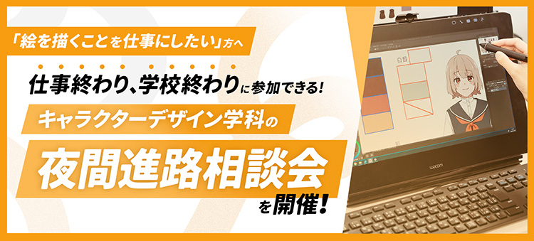キャラクターデザイン学科では、絵を描くことを仕事にしたくて、じっくり相談したいけど、なかなか時間が取れないという方向けに夜間進路相談会を開催しています。