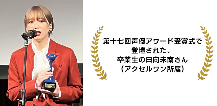 今回、3年ぶりに会場での授賞式が開催された「第十七回 声優アワード」。3月11日に都内で受賞式が行われ、今回もAMG卒業生である、日向未南さん(アクセルワン所属)が新人声優賞を受賞しました。