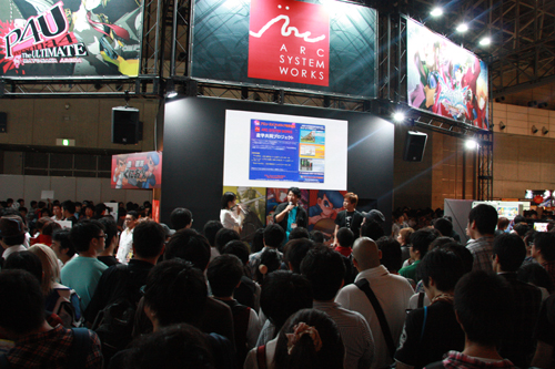 「BLAZE BLUE」「GUILTY GEAR」シリーズなど、人気ゲームソフトをもつアークシステムワークス株式会社のブースでは常に人だかりと長蛇の列。