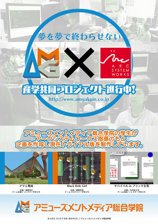 2011年4月から開始した、「アミューズメントメディア総合学院×アークシステムワークス 産学共同プロジェクト」。企画の選考、開発作品の決定を受け、現在3作品がトライアル版の制作中です。