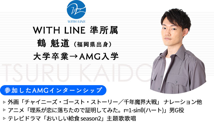 大学卒業後、エンタテインメント性のある仕事に就きたいと思い、職業を探すなかで、声優を目指すことにしました。AMGでは、様々なプロダクションのオーディションを受けることができます。演技未経験で、業界についてなにも分からなかった私にとって、進路の選択肢が多いということは、とても魅力的でした。在学中は、インターンシップをはじめ、数多くの現場に立たせていただきました。自分のお芝居への追求はもちろん、プロの方々のお芝居や現場での立ち振る舞いなどを学ぶことができ、大変貴重な経験でした。これからも、生涯を通じ、お芝居を愛してやまない役者でありたいです。